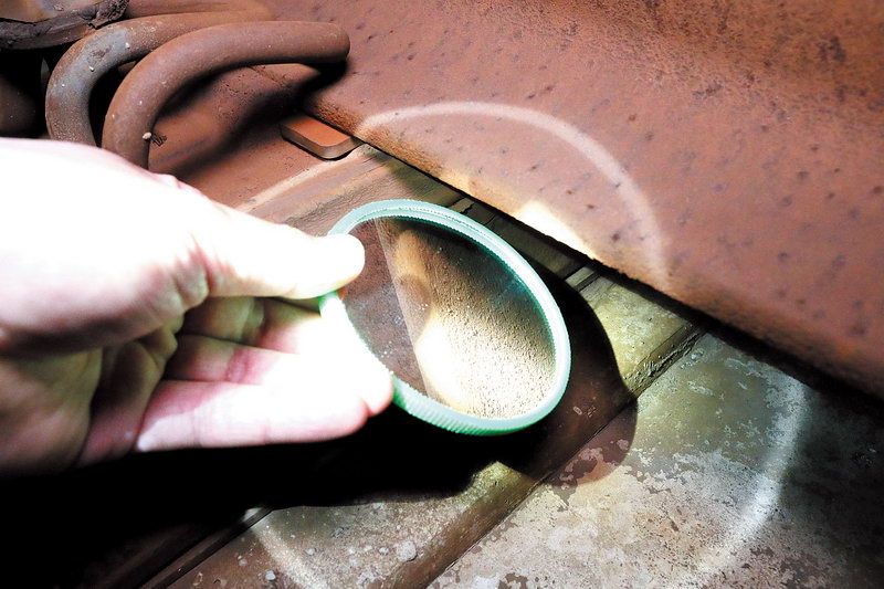 通过小镜子看轨底有无伤痕 ■记者 周宇杰/摄