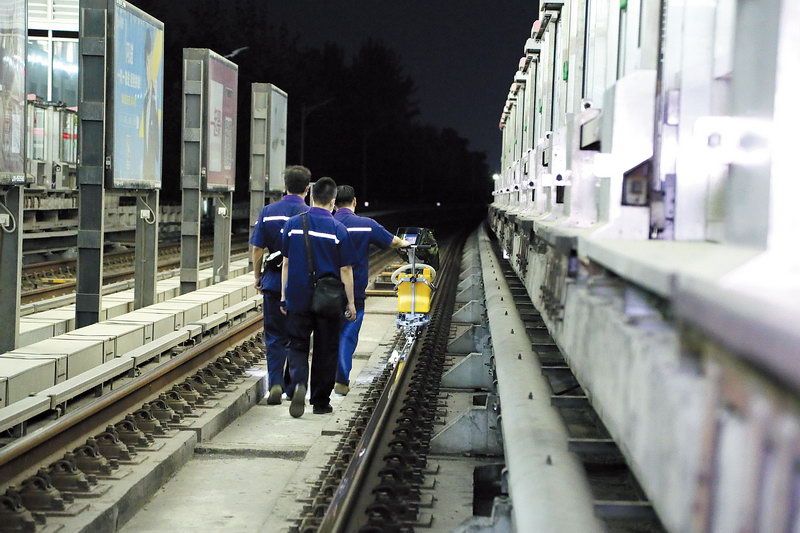 按照当天晚上的计划,钢轨探伤工们需要推着探伤仪由亦庄桥站走到万源街站,来回行程约有5公里。