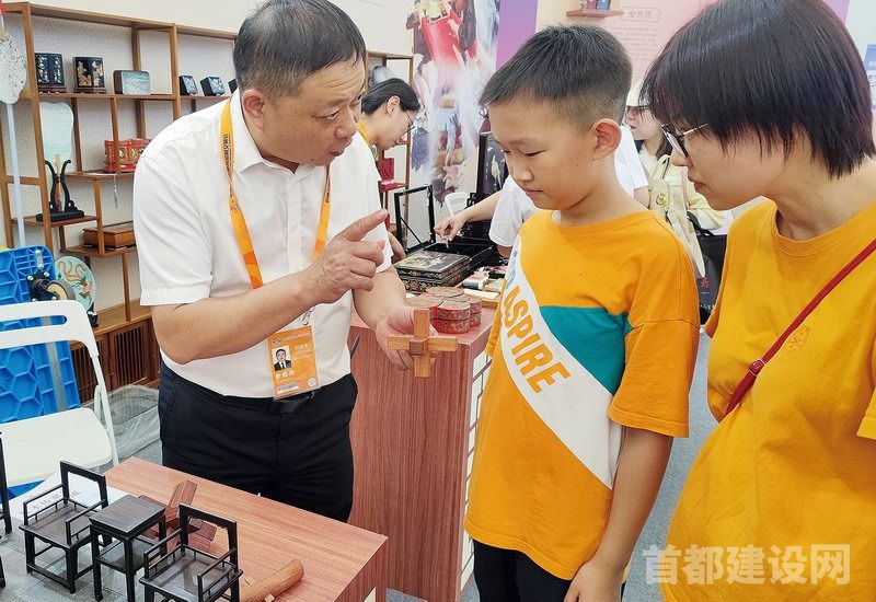 国家级非遗项目龙顺成京作硬木家具制作技艺第五代代表性传承人、2021 年“大国工匠”年度人物刘更生向观展的小朋友介绍榫卯结构。