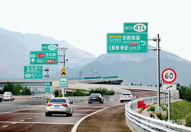 京蔚高速北京段开通,车辆由西六环军庄互通立交驶入京蔚高速 ■记者 周宇杰/摄