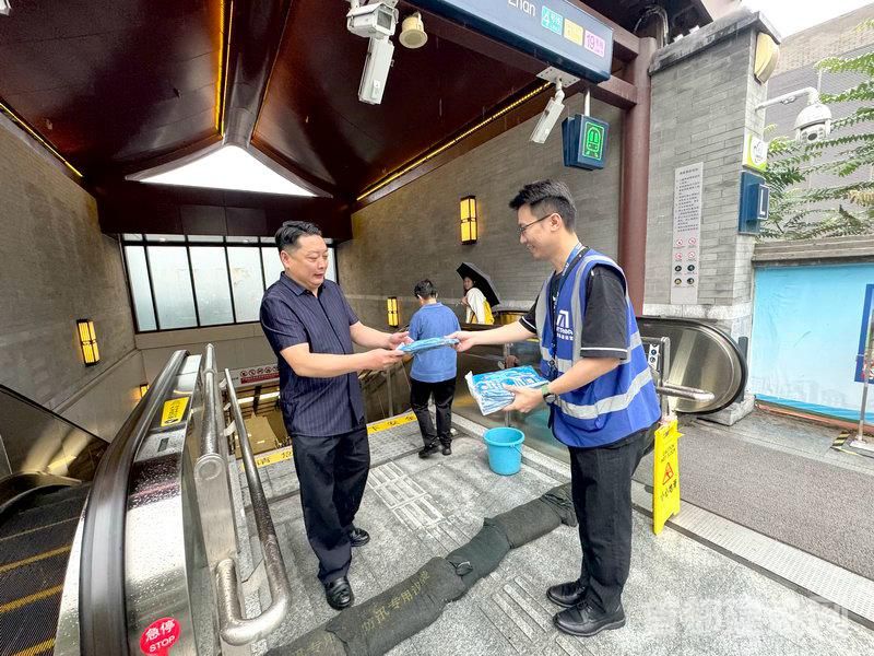 工作人员向乘客发放一次性雨衣 ■企业/供图