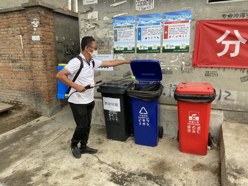 首农食品集团职工给社区垃圾桶消毒 ■企业/供图