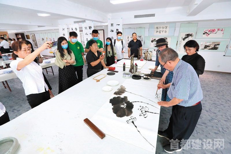 以“首都国企开好局起好步,喜迎建党100 周年”为主题的“首农杯”国企职工书画大赛展览举办了笔会活动,国企书画爱好者们现场交流创作。